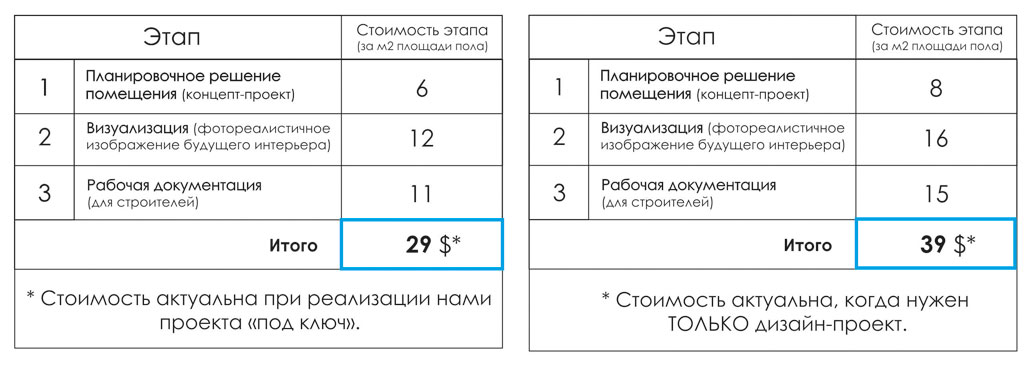 Максимально оптимизировав расходную часть, мы смогли получить весьма приемлемую цену за полный дизайн-проект, включающий в себя: Расчет ведется по курсу Нацбанка на день заключения договора + 2%. Стоимость авторского надзора оговаривается индивидуально. Система оплаты поэтапна: • 50%— предоплата производится перед началом каждого этапа; Например : стоимость дизайн-проекта квартиры площадью 50 м2 = (50 м2 · 29 у.е.) = 1450 у.е При этом предоплата за первый этап составит 145 у.е. Остальная сумма будет выплачиватся частями по мере этапности создания дизайн-проекта. Помимо этого мы гарантируем дополнительные услуги и бонусы при большой площади помещения. К каждому следующему этапу мы приступаем только полностью согласовав и утвердив с Вами предыдущий. Также у Вас есть возможность выбрать только те этапы дизайн-проекта интерьера, которые Вам необходимы. Это позволит сконцентрировать Нашу работу на самом важном для Вас этапе. При условии оперативного взаимодействия с заказчиком дизайн-проект квартиры площадью 70-90 кв.м. будет выполнен в течение двух месяцев, то есть в среднем 1-2 недели на комнату. С удовольствием ответим на все уточняющие вопросы по телефону 8(029) 107-8-701. Звоните! |
